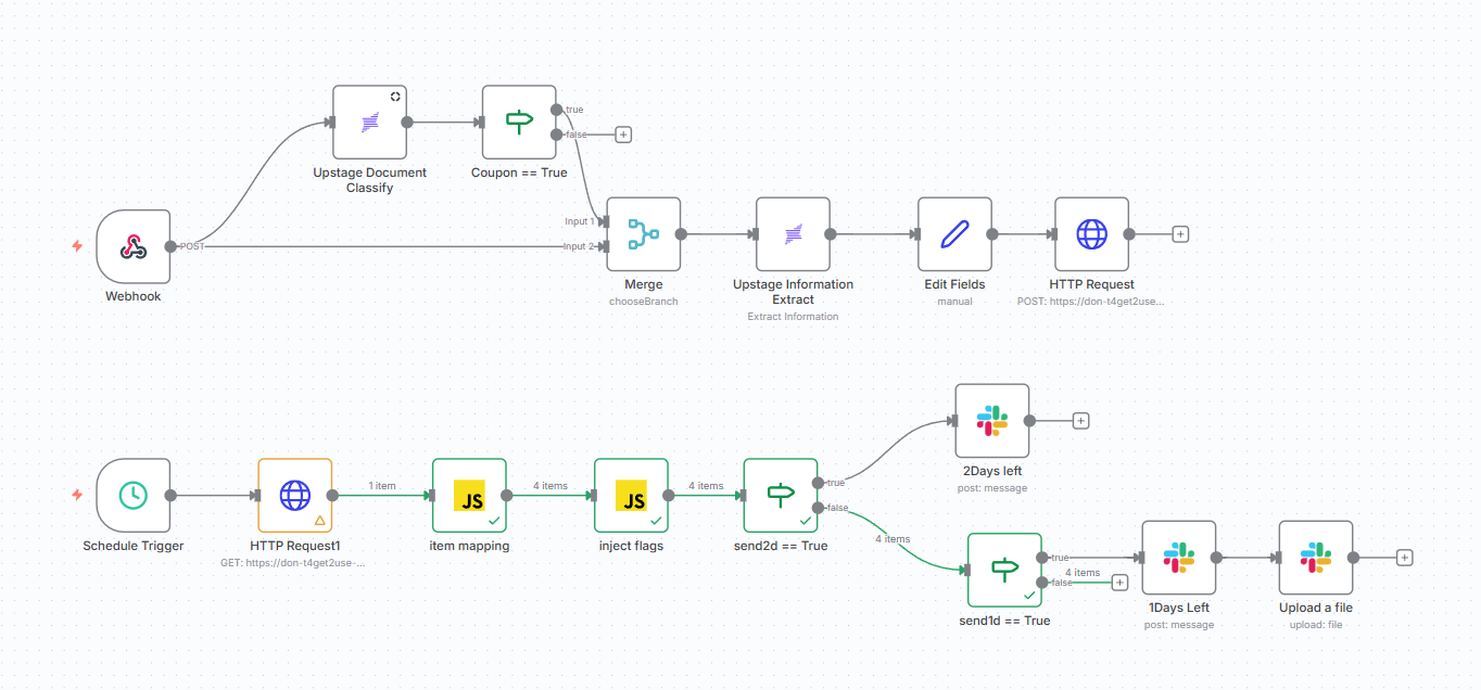 스크린샷을 찍으면 우선 쿠폰인지 아닌지 Upstage Document Classify를 이용해 분류한 후, 핵심 정보(유효기간 등)를 Information Extract를 사용해 추출하여 사용자에게 알림을 보내줍니다. 1일 전까지 쿠폰을 사용하지 않으면 친구에게 기프티콘 링크를 전송합니다.