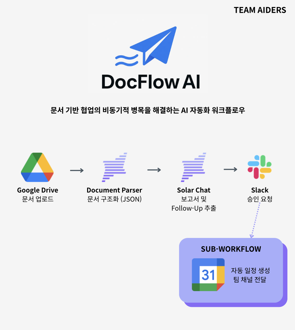 저희는 이 문제를 해결하기 위해 n8n와 Slack 기반의 자동화 워크플로우와 Upstage의 Document Parser, Solar Chat 노드를 중심으로 한 AI 기반 협업 자동화 시스템 DocFlow AI를 개발했습니다.