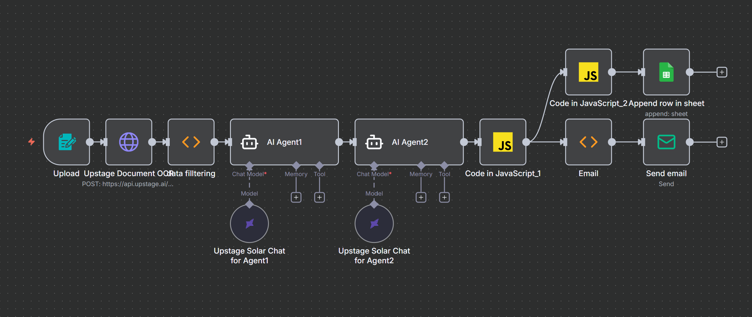 사용자가 영수증 이미지를 업로드하는 순간, Upstage의 Solar Pro 2와 Document Parse API가 즉시 작동합니다. OCR 기술로 텍스트를 추출하고, Solar LLM이 가계부 필수 데이터(구매 품목, 금액, 날짜 등)를 정확히 식별합니다.