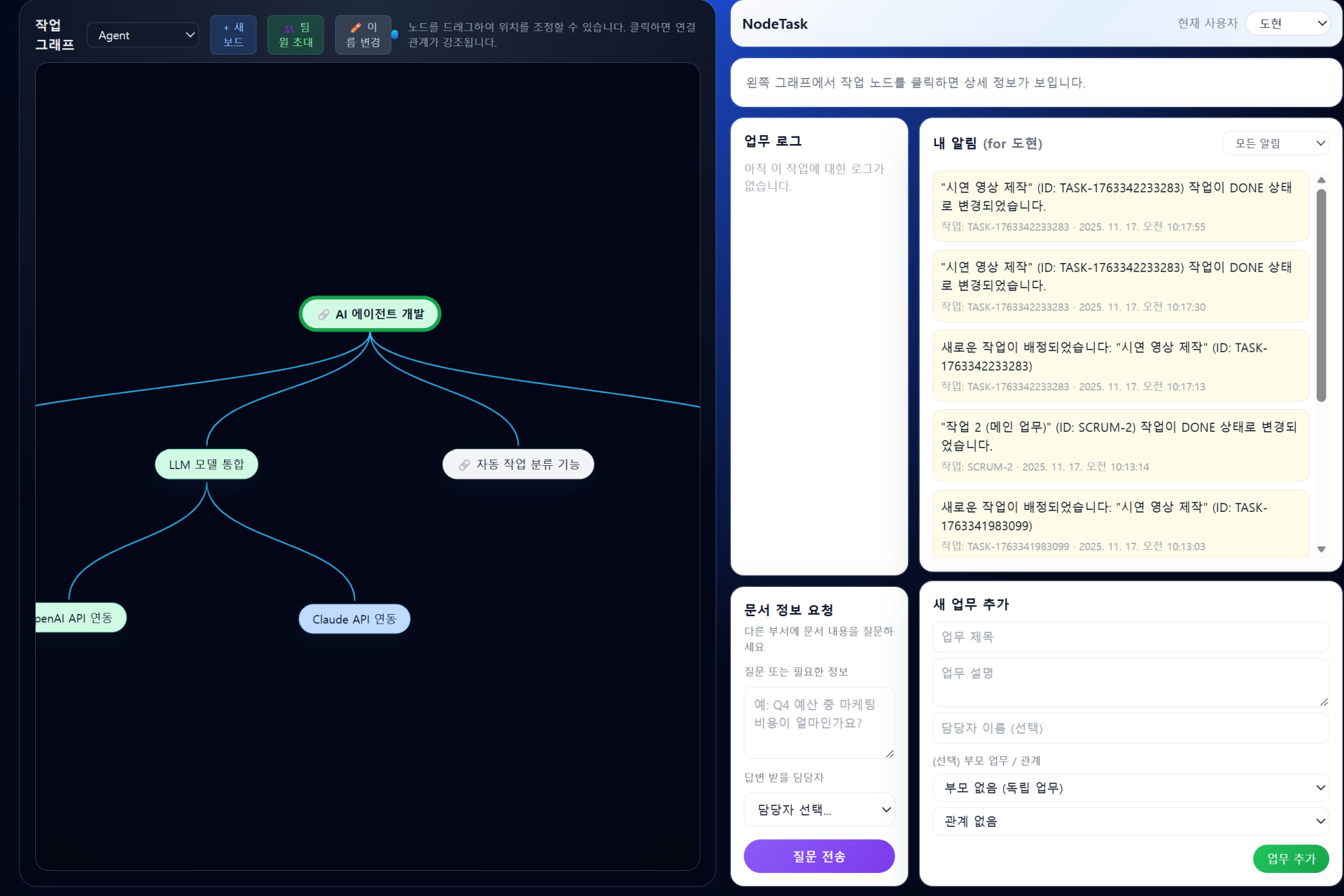 업무들을 그래프 구조로 시각화하여, 상태·중요도·의존 관계를 한 화면에서 직관적으로 확인할 수 있도록 설계했습니다. 업무 생성 및 완료 시 담당자에게 자동 알림을 제공하고, 중요 업무·담당 업무·문서 요청 등 다양한 필터링 기능으로 필요한 정보만 빠르게 확인할 수 있습니다. 또 여러 개의 보드를 생성하여 부서·프로젝트별로 분리 관리할 수 있으며, 서로 다른 보드의 업무끼리도 관계를 연결할 수 있어 부서 간 협업이 자연스럽게 이루어집니다. 그래프 구조는 새로고침해도 유지되도록 구현했고, 업무로그에서 제목·설명·담당자·관계까지 즉시 수정할 수 있습니다. 또한 문서 요청과 피드백, 요청도 n8n 자동화, LLM사용으로 차질 없는 실시간 협업 환경을 제공합니다.