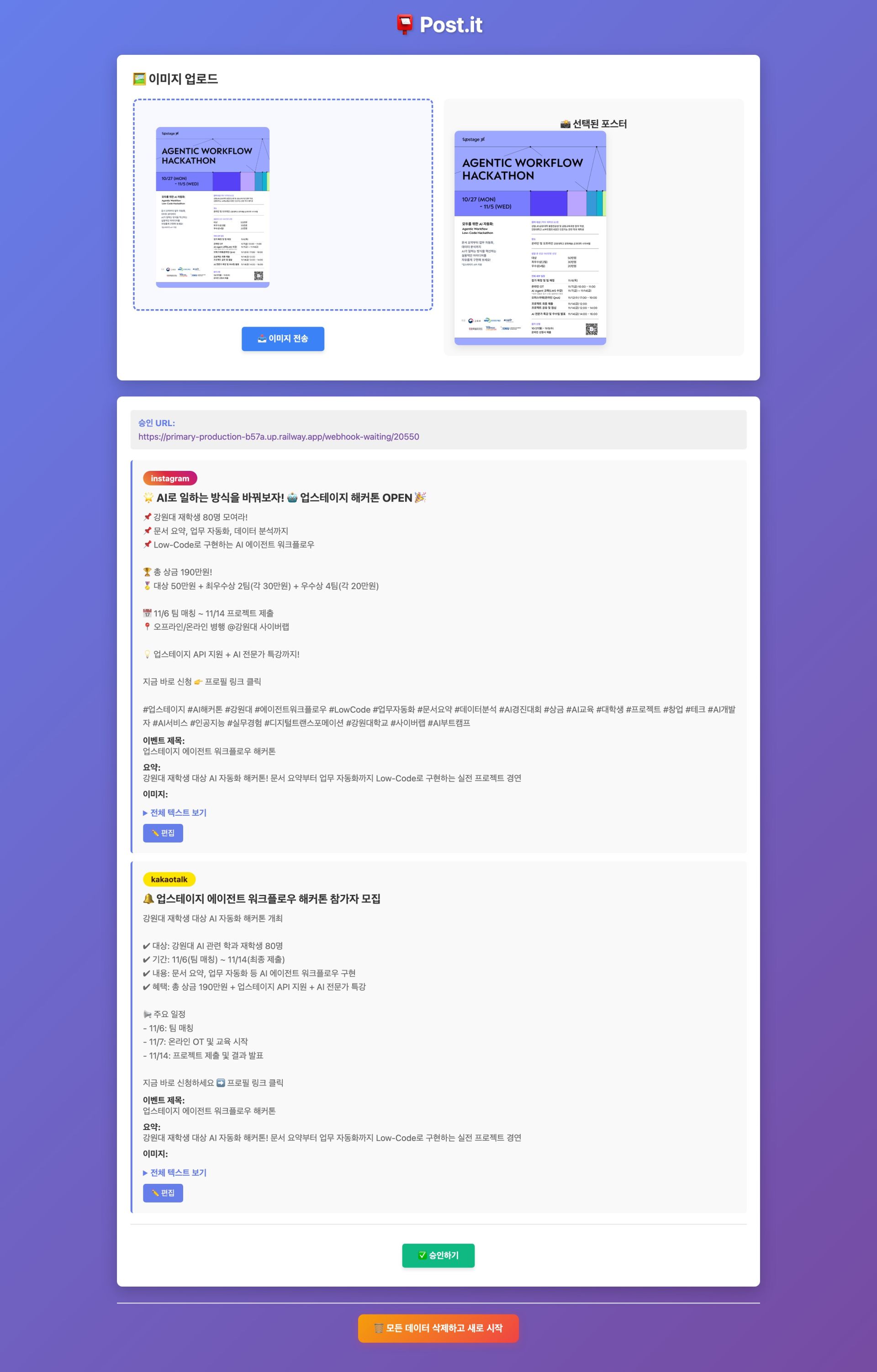행사나 공지 포스터는 대부분 이미지 형태로 제작되어 텍스트 추출이 어렵고, SNS 채널별로 다른 문체와 형식에 맞춰 수동으로 재작성해야 하는 번거로움이 있습니다. "Post.it"은 이러한 문제를 해결하기 위해 OCR 기술과 Solar Pro 2 LLM을 결합한 AI 기반 자동화 솔루션입니다. 이미지 포스터를 업로드하면 핵심 정보를 인식하고, 인스타그램·블로그·X(트위터)·카카오톡 등 플랫폼별 최적화된 홍보 문구를 생성하며, 생성된 콘텐츠를 체계적으로 관리할 수 있는 워크플로우를 제공합니다.