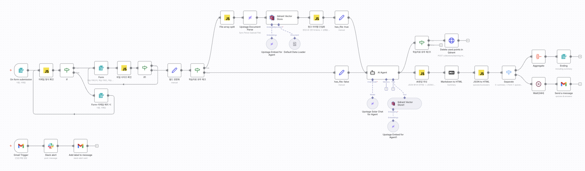 - AI Agent가 Qdrant에서 관련 청크 검색 → Solar Chat for Agent로 정리본 및 퀴즈 생성
